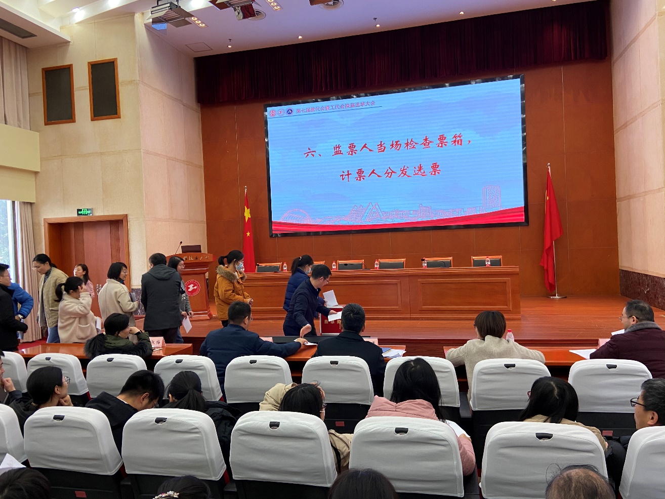 教代会代表选举大会在全体齐唱国歌声中开幕。会上宣读了《公司教职工代表大会选举办法》提交大会审议。该选举办法经大会现场举手表决,全体通过。随后大会审议通过了监票人和计票人名单,经大会审议举手表决,全体通过11位候选人建议名单。