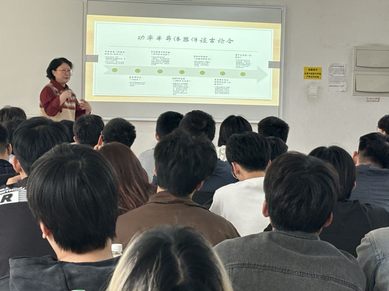 林青专家从事芯片的研发和应用工作20余年,凭借其丰富的行业经验和扎实的基础知识,在课堂上将功率器件芯片的有关理论知识和实际应用进行有机融合,向同学们展示了功率器件芯片的研究现状和应用环境,并详细介绍了芯片的质量标准和评价方案,强调了科学技术就是第一生产力的重要性。林青专家重点强调随着5G时代的到来和技术的进步,新型功率器件如碳化硅(SiC)和氮化镓(GaN)等材料制成的器件,因其优异的耐高压、耐高温、低损耗等性能,能够满足电力电子系统的高效率、小型化和轻量化要求,因此在新能源汽车、光伏发电、轨道交通、智能电网等领域具有明显优势。