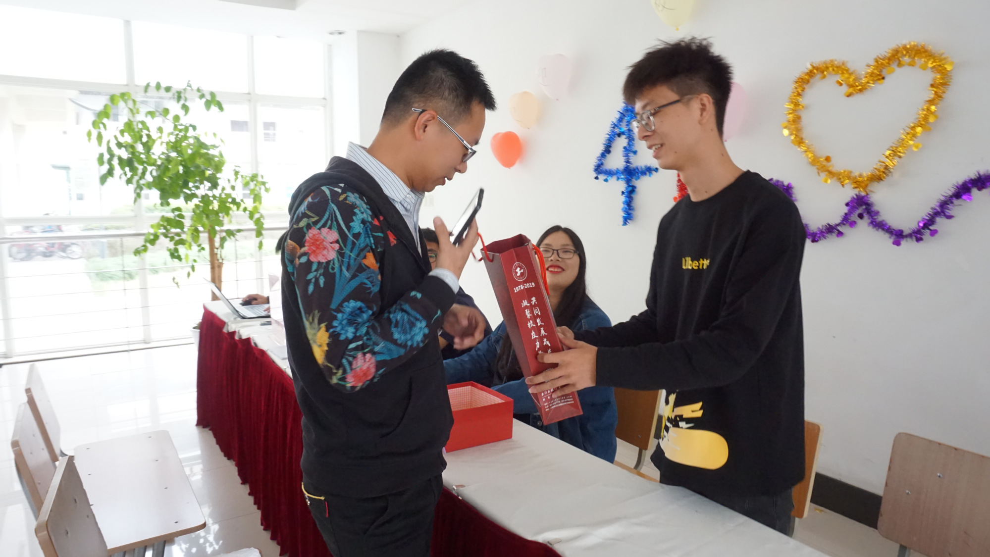 报到现场,许许多多员工在遇到当年老同学时,相互握手问候,畅谈在一起的大学时光,谈毕业后的工作生活,老友重逢,内心的喜悦激动洋溢在每个人的脸上。