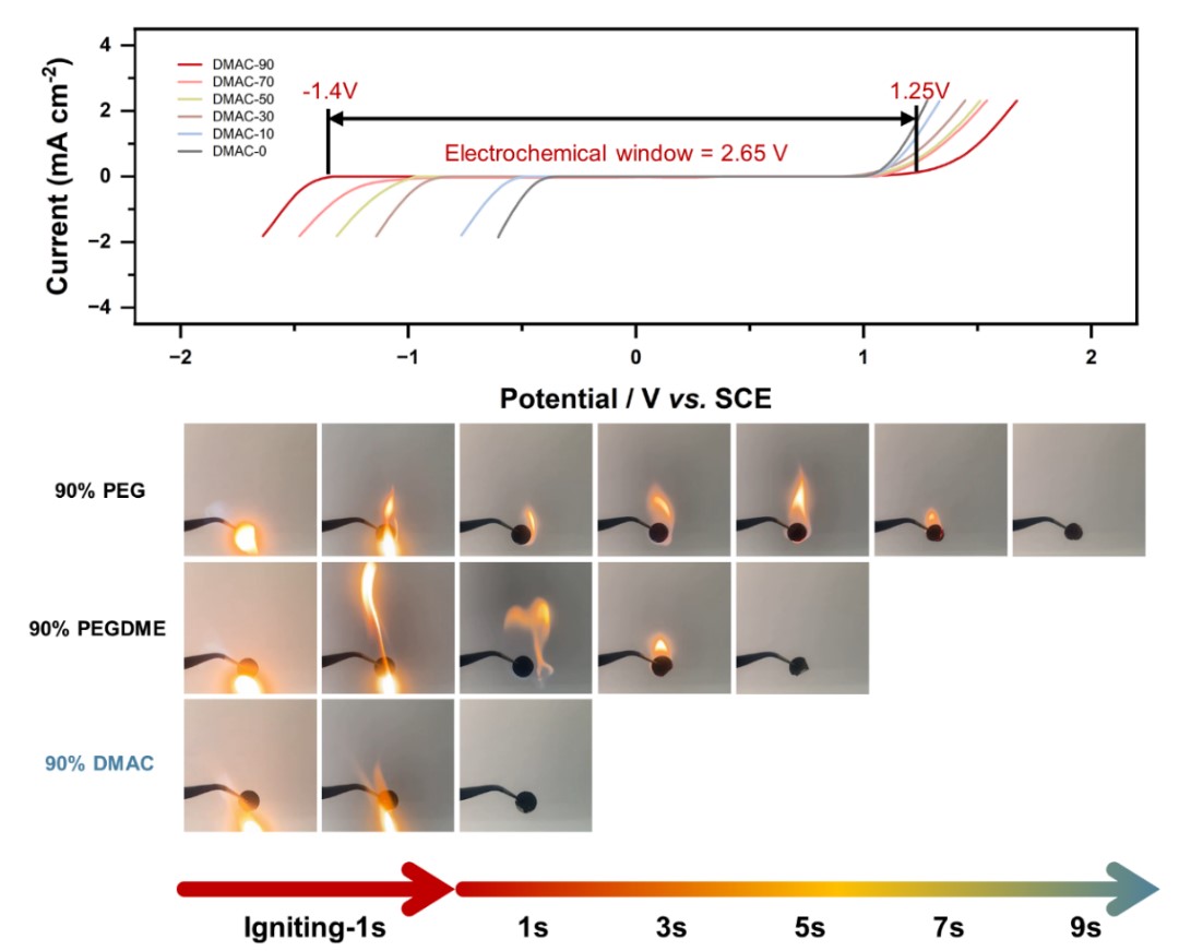 基于分子拥堵策略,以CF3NaO3S为钠盐,N - N二甲基乙酰胺(DMAC)为分子拥堵剂,将1 M CF3NaO3S充分溶解在不同浓度DMAC(10%wt - 90%wt)的混合水溶液中制备成分子拥堵水系电解液。实验结果表明,N - N二甲基乙酰胺作为分子拥堵剂时可显著将水的电化学稳定窗口扩大至2.65 V,同时具有良好的不可燃性和电导率(9.8 mS cm-1),综合性能优异。匹配正负极材料组成的全电池提供了67 mAh g-1的初始比容量,在600次循环后仍保持58 mAh g-1的高比容量,容量保留率为75%,容量衰减率为0.041%每循环,测试过程中全电池的库仑效率始终稳定在99%以上。硕士研究生李帅帅同学为该项工作的第一作者,指导教师李文尧教授为通讯作者,以“An improved N–N dimethylacetamide-based non-flammable molecular crowding electrolyte using NaOTf for cobalt-based prussian blue//hard carbon aqueous solution battery”(https://doi.org/10.1016/j.jcis.2024.09.018)为题发表在中科院一区期刊Journal of Colloid And Interface Science (IF= 9.4)上。