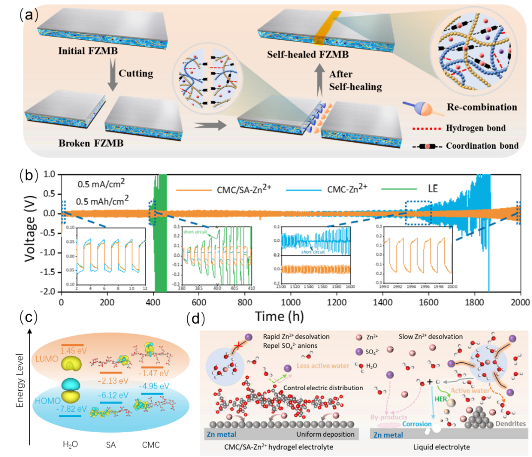 采用双交联结构构建了一种新型柔性锌-二氧化锰电池(FZMB),该体系以CMC/SA-Zn2+作为自愈合水凝胶电解质。此路径避免使用石油化工聚合物及化学交联剂,其中Zn2+不仅充当离子导体,还作为交联剂促进双重交联结构形成。CMC和SA中众多阴离子功能团对Zn(002)晶体平面的强吸附作用与协同效应,有助于维持Zn阳极上的平衡离子流并促进晶体平面沿水平方向均匀增长(E-P机制)。此外,自愈合FZMB能够为电子设备提供稳定且连续、不间断的供能,即便在裁剪、弯曲或清洗等严苛条件下也能保持良好表现。团队青年教师杨燕平博士为该成果的第一作者兼通讯作者,以“High voltage, toughness and improved interfacial ion deposition through a dual-crosslinked and self-healable hydrogel electrolyte for green Zn-MnO2 batteries”(https://doi.org/10.1016/j.cej.2024.149780)为题在中科院一区期刊Chemical Engineering Journal(IF=13.3)上发表。