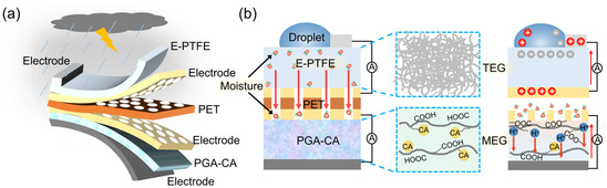 (a) 复合发电机的示意图结构。(b) 复合发电机摩擦起电和湿气发电的工作原理。