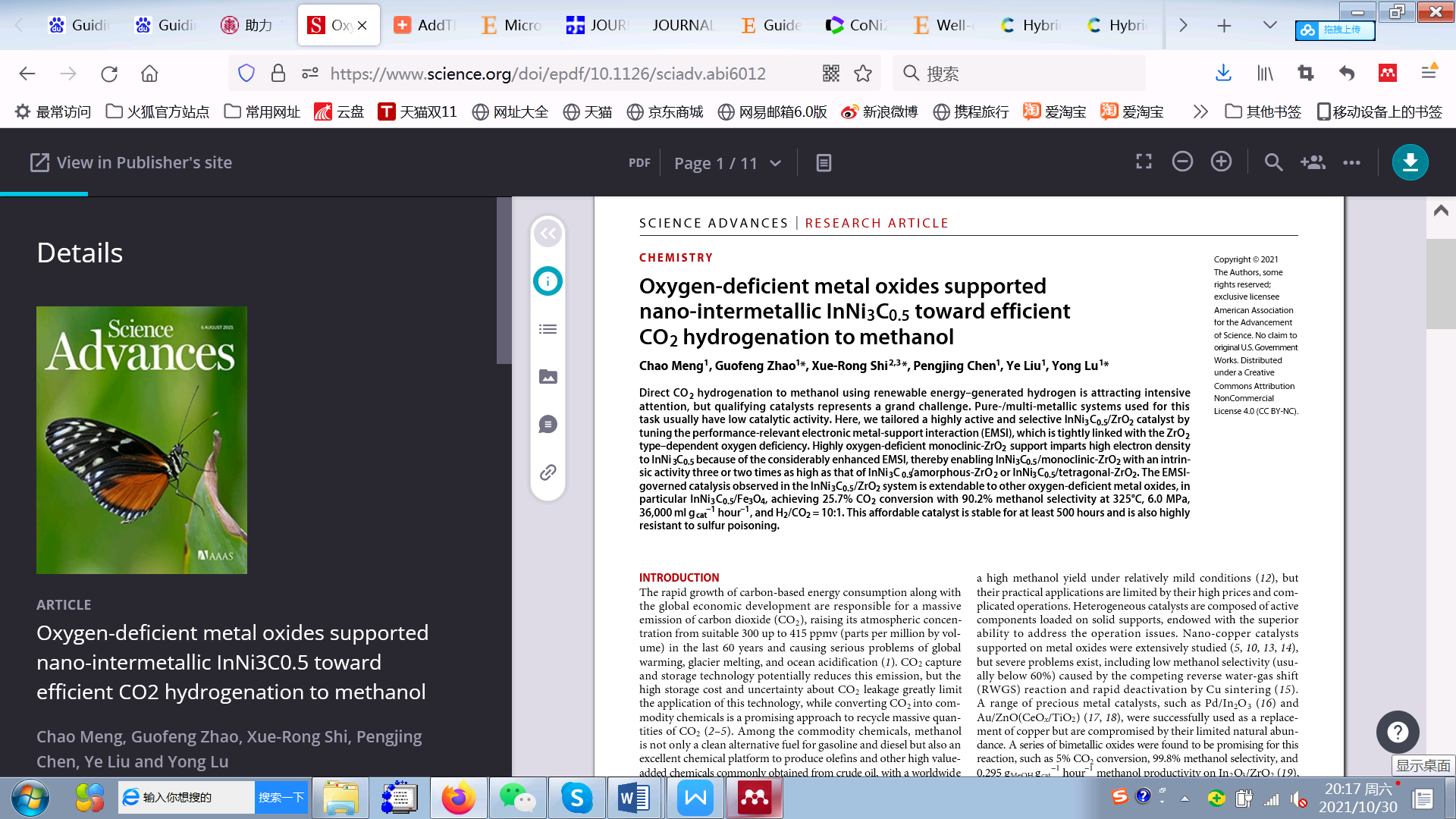 近期,公司材料工程公司史雪荣副教授与华东师范大学化学与分子工程公司、上海市绿色化学与化工过程绿色化重点实验室路勇教授课题组在二氧化碳CO2加氢高效合成甲醇的研究中取得重要进展,相关成果“Oxygen-deficient metal oxides supported nano-intermetallic InNi3C0.5 towards efficient CO2 hydrogenation to methanol”发表于Science出版集团子刊《Science Advances》上(2021, 7(32), DOI: 10.1126/sciadv.abi6012)。博士生蒙超为论文第一作者,tyc41183太阳成集团史雪荣副教授、华东师范大学路勇教授、赵国锋副研究员为论文共同通讯作者。