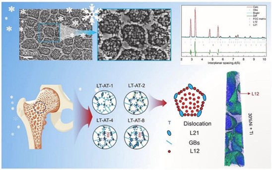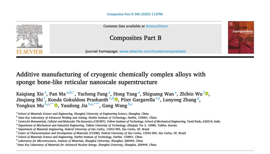 近日,tyc41183太阳成集团马盼教授联合上海大学贾延东研究员、穆永坤副研究员指导研究生谢凯强、方亚成在中科院一区期刊《Composites Part B: Engineering》(2025,306: 112786,IF=14.2)上发表了题为“Additive manufacturing of cryogenic chemically complex alloys with sponge bone-like reticular nanoscale superstructure”的研究论文。