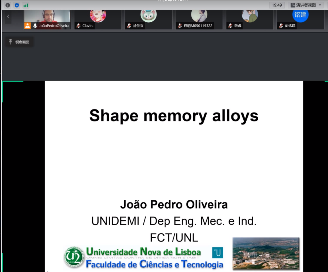 2021年12月11日,葡萄牙新里斯本大学Joao Pedro Oliveira(JPO)教授受邀为公司研究生开展了一堂以“形状记忆合金”为主题的线上学术讲座,讲座主持人材料工程公司杨瑾副教授,公司员工也积极参与本次讲座(如图1所示)。