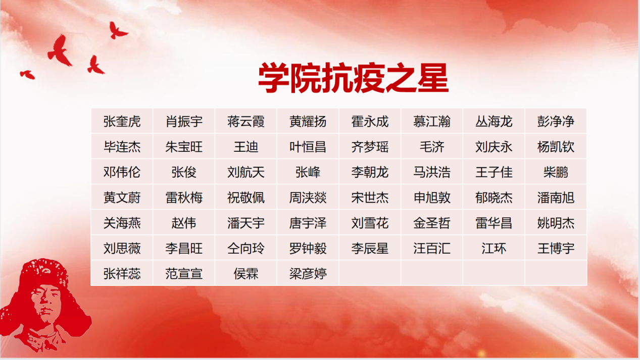 最后,校特邀党建组织员、校关工委委员、校关工委常务副主任刘宇虹赞扬了材料小叶子、抗疫先锋、扶贫志愿者、退伍员工、红火讲师团、科研工作者的时代回答,展现了新青年们的时代担当,激励大家向身边的平凡榜样学习。
